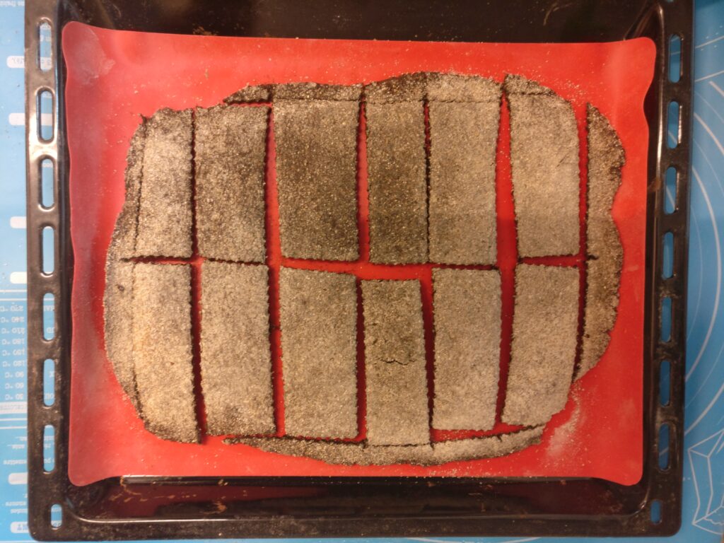 Valmiiden näkkärien paino on ainakin pian paistamisen jälkeen pienempi kuin jauhojen tai kuiva-aineiden, joka selittää yllä kuvassa olevien kutistumista verrattuna uuniin menossa olevien alla olevassa kuvassa.