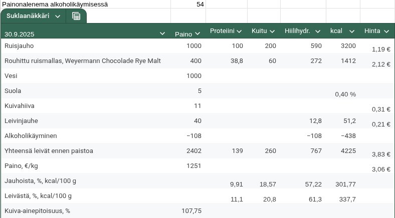 Resepti/ravintoainelaskelma on seuraavanlainen: