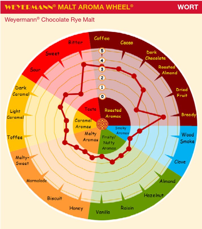 Suklaapaahdettuja maltaita olisi muitakin, mutta rukiista taitaa tällä hetkellä olla tarjolla suomalaisissa kaupoissa vain Weyermannin, jonka makukartta on alla: