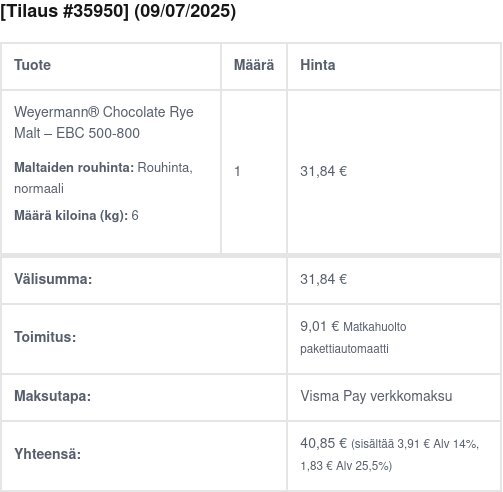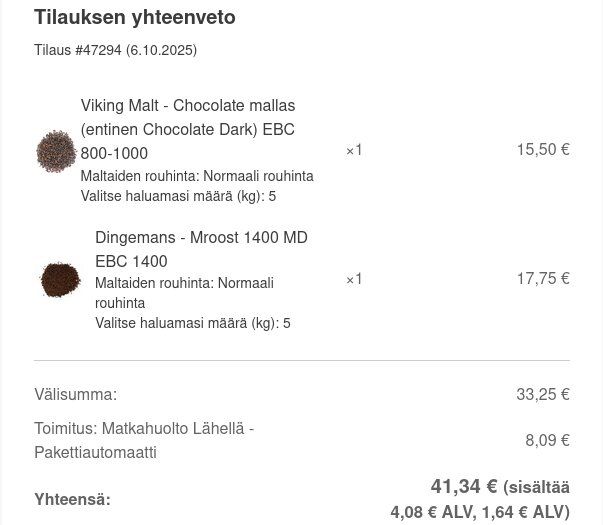 Yhteensä siis 10 kg tummaksi paahdettuja ohramaltaita kahdelta eri valmistajalta. Heinäkuussa lähes samalla laskun loppusummalla sai vain 6 kg Weyermannin Chocolate Rye -maltaita: