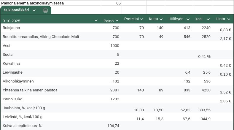 Ei nuo ohramaltaat silti huonolta maistu ja olen molempia jo aikaisemmin kokeillut ja käyttänyt ruismaltaiden ohessa. Tällä kertaa, kun ajatuksena oli kasvattaa mallasten osuutta, niin ajattelin, että samalla voisi käyttää pelkästään halvempia ohramaltaita, jolloin kokonais- tai kilohinta pysyisi suunnilleen samana ja niin se pysyikin. Edellisellä kerralla maltaita oli 400 g, jauhoja 1000 g ja nyt molempia oli yhtä paljon. Kilohinta laski 3,06:sta 2,86 euroon. Edellisen kerran resepti on kirjoituksessa Suklaanäkkäri ja uusi alla: